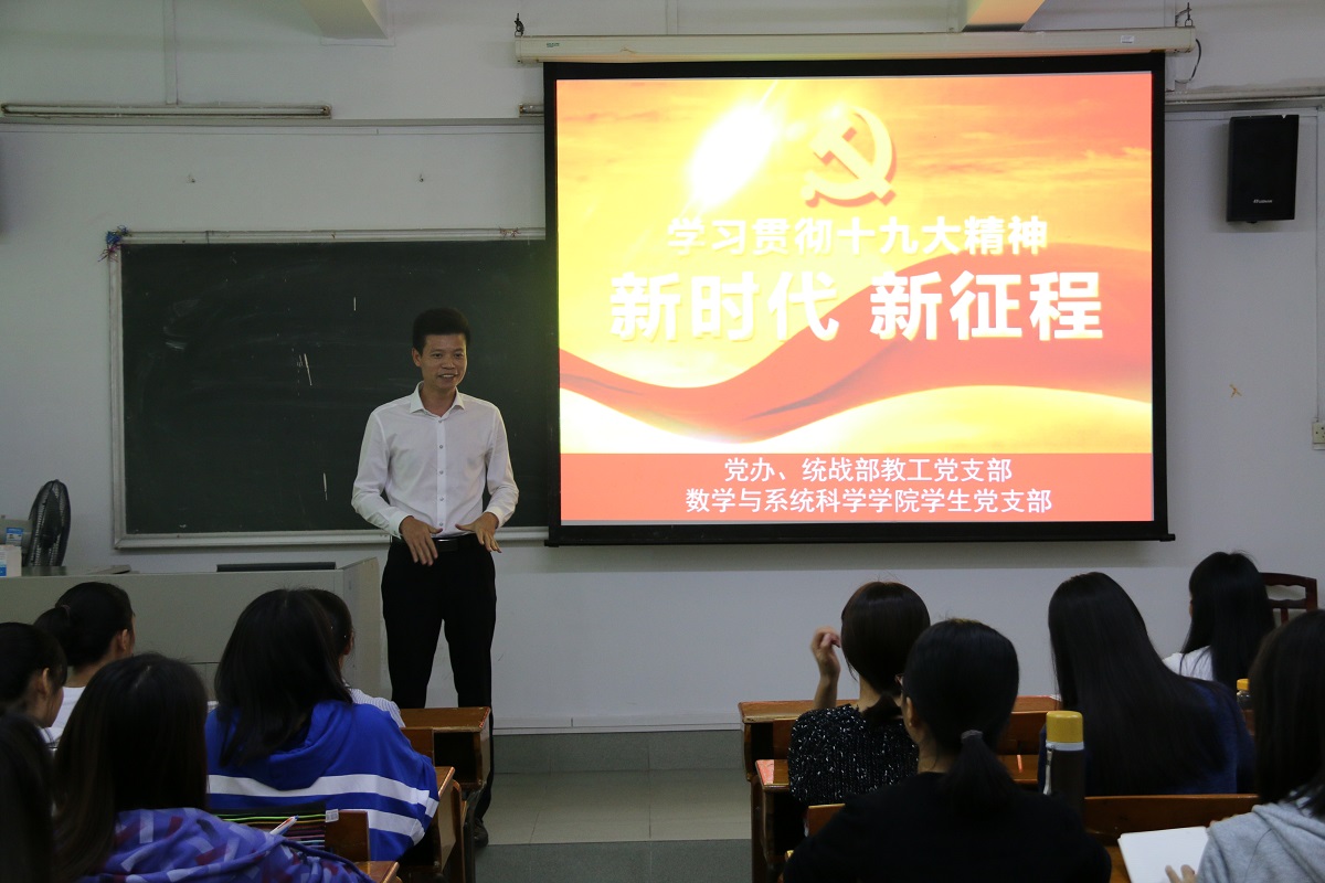 學校黨辦副主任、統(tǒng)戰(zhàn)部副部長兼黨支部書記黃文浩作了題為《新時代.新思想.新征程——學習貫徹十九大精神》的專題黨課,他重點從“新成就、新使命、新思想、新征程、新經濟、新政治、新文化、新社會、新生態(tài)、新國防、新統(tǒng)一、新外交、新黨建”等十三方面,對黨的十九大精神進行了系統(tǒng)解讀。勉勵學生黨員以身作則、身先垂范帶頭學習,領悟好、貫徹好黨的十九大精神,帶領廣大同學們爭做新時代新青年,在學新思想中努力做到有新擔當、有新作為、做新奉獻。